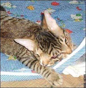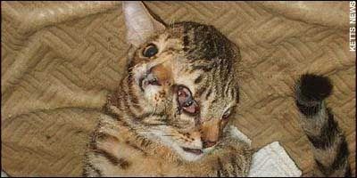這只怪貓有兩張嘴,兩個鼻子,四只眼睛。獸醫認為它還可能有兩個大腦,因為當它的一張臉睡覺時,另一張臉能夠繼續保持清醒,而且它還可以分別眨每一只眼睛。這只 貓咪的主人說:“當它發出咕嚕咕嚕聲時,聽起來就像立體聲。”